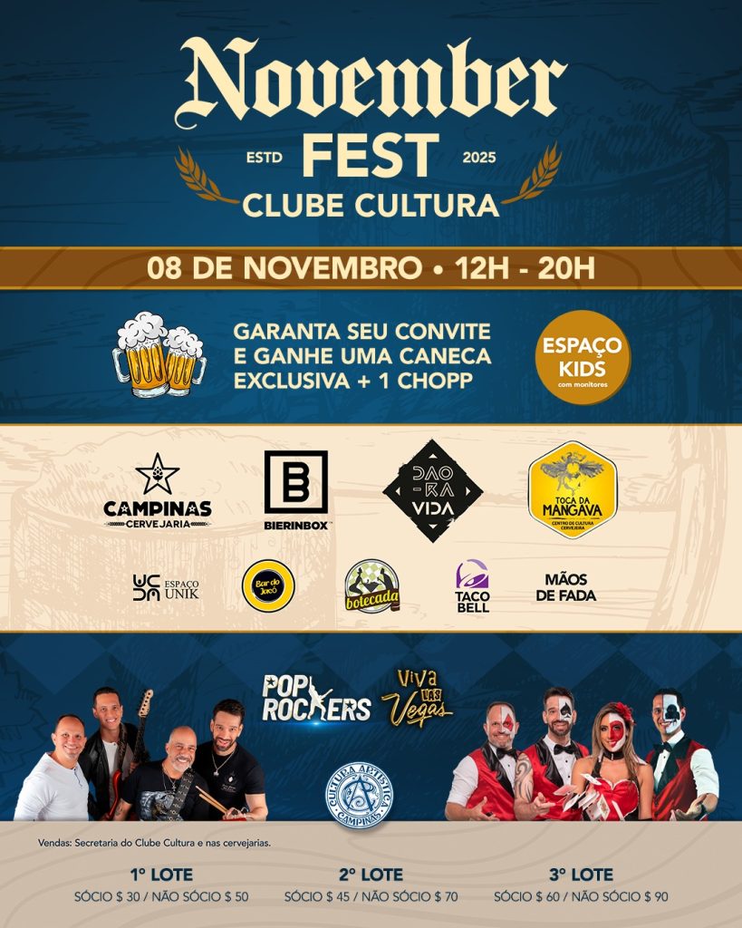 O Clube Semanal de Cultura Artística prepara uma festa inesquecível para celebrar a inauguração das novas quadras cobertas: a November Fest, no estilo das tradicionais festas do chopp. O evento acontece no dia 8 de novembro de 2025 (sábado), das 12h às 20h, no próprio clube, em Sousas.