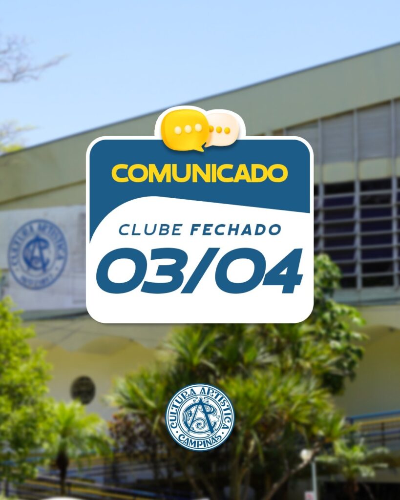 O Clube Cultura informa aos associados que, em razão do feriado da Sexta-feira Santa, no dia 3 de abril, o clube estará fechado, com todas as atividades suspensas nesta data.