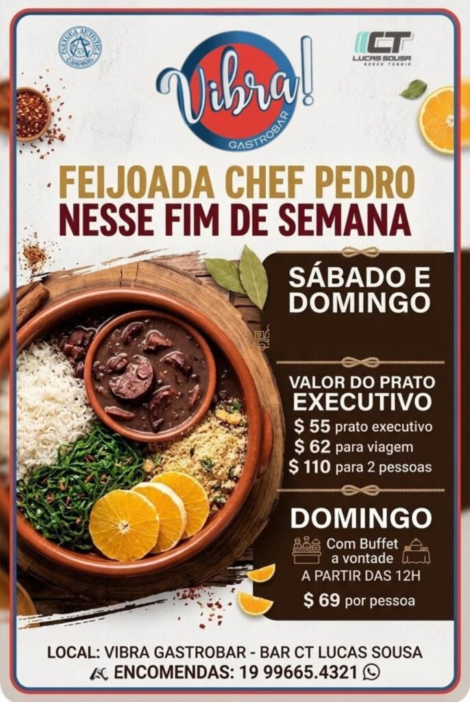 O fim de semana no Clube Cultura será marcado por uma experiência gastronômica especial. O Vibra Gastrobar, localizado no espaço do CT Lucas Sousa, promove a tradicional Feijoada do Chef Pedro, reunindo sabor, qualidade e aquele clima perfeito para curtir bons momentos.