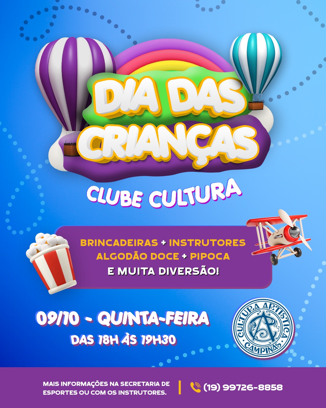 O Clube Cultura vai transformar a quinta-feira, 9 de outubro, em um dia inesquecível para os pequenos associados. A partir das 18h até 19h30, o
